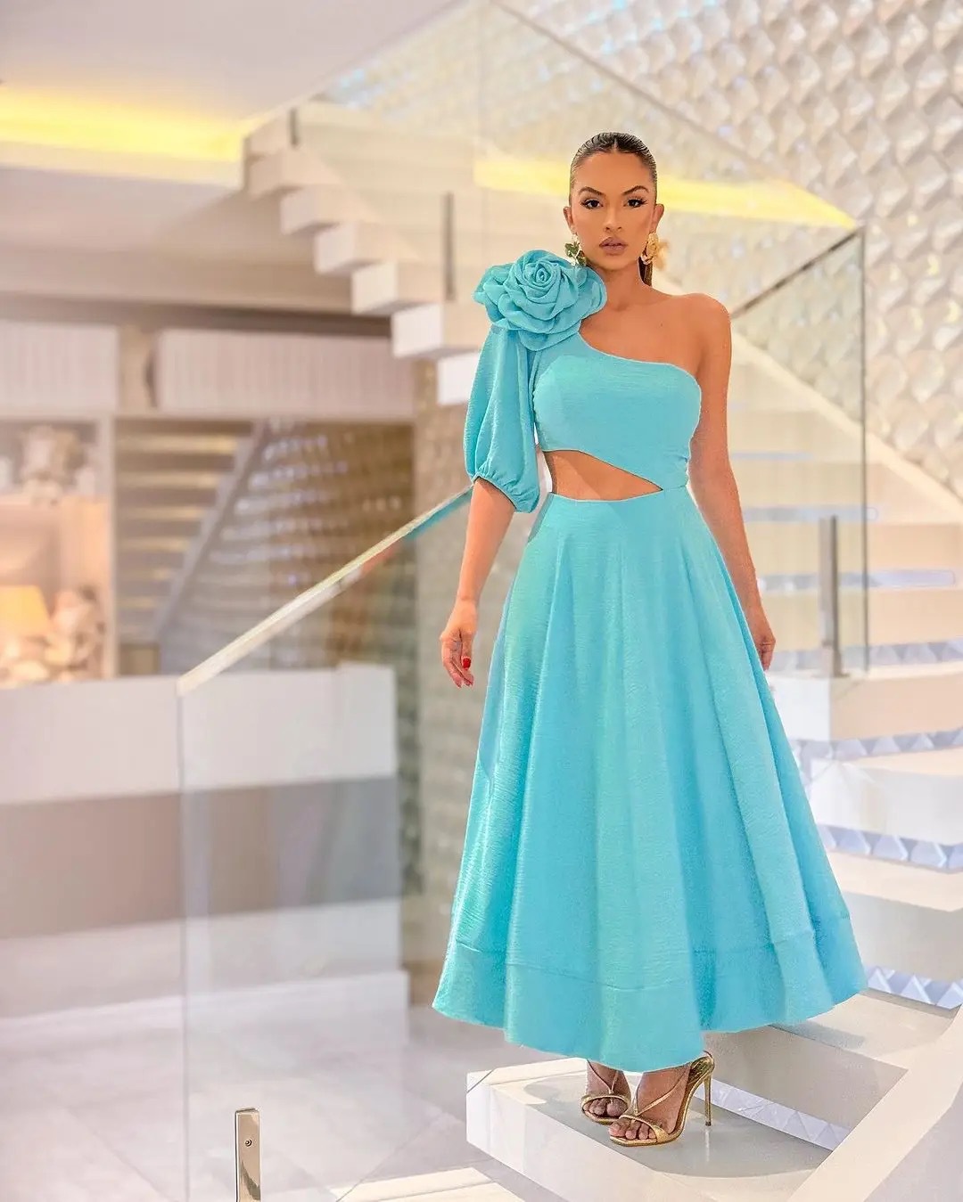 Inspirado na alta moda da primavera/verão, o modelo apresenta design de um ombro só, com grande flor decorativa e saia ampla fluida, transmitindo romantismo e elegância em cada movimento.